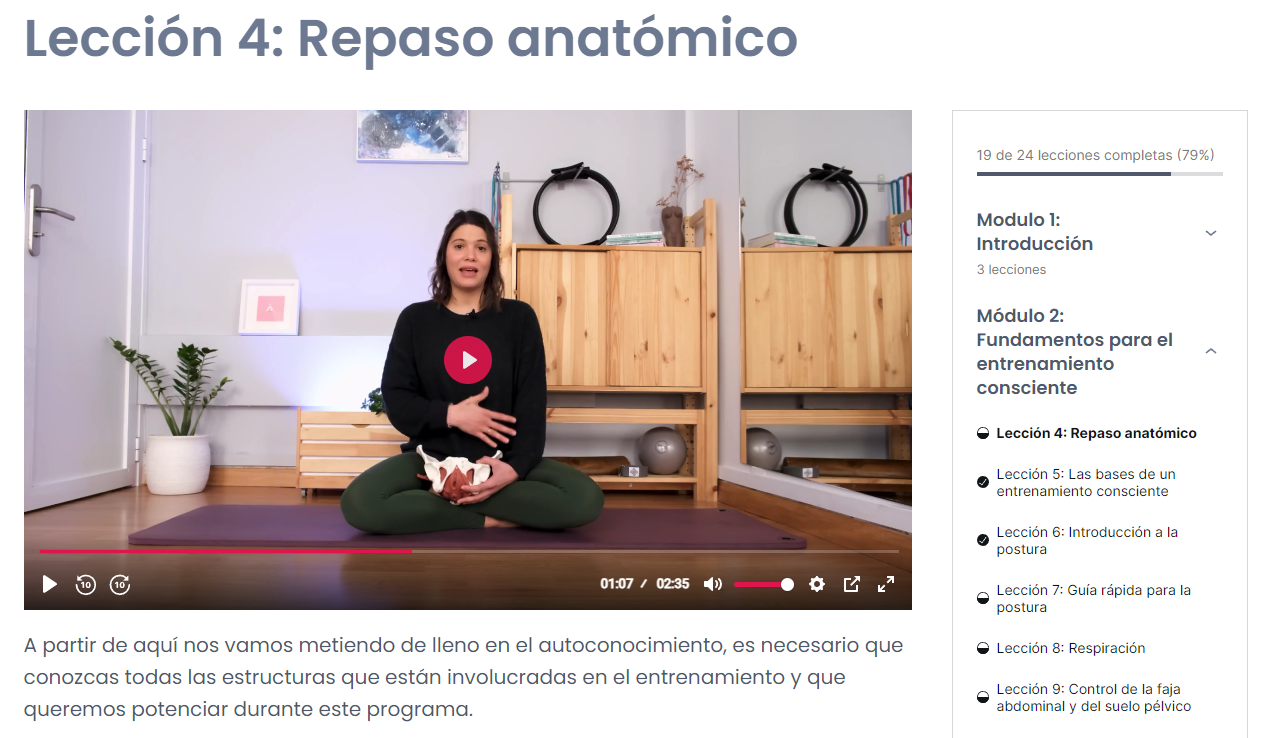 En segundo lugar, la estructura del curso permite una compatibilidad total con un periodo en el que el tiempo casi parece el enemigo, como es el postparto. La duración de los vídeos permite organizarse muy bien y, a medida que pasan las semanas, ¡hasta he conseguido hacer los ejercicios con mi bebé a un ladito!